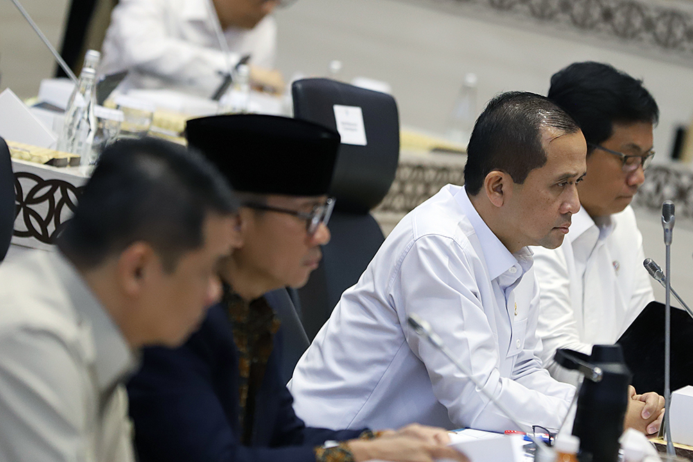 Ketua Komisi V DPR Lasarus (kedua kiri) bersama Wakil Ketua Komisi Ridwan Bae (kiri) berbincang dengan Menteri Transmigrasi Muhammad Iftitah Sulaiman (kedua kanan), Wakil Menteri Transmigrasi Viva Yoga Mauladi (kanan), dan Wakil Menteri Desa dan PDT Ahmad Riza Patria (tengah) sebelum mengikuti rapat kerja di Kompleks Parlemen, Senayan, Jakarta, Selasa (16/9/2025). Rapat tersebut membahas keberadaan desa dan kawasan transmigrasi yang dinyatakan berada dalam hutan atau taman nasional. (BeritaNasional/Elvis Sendouw)